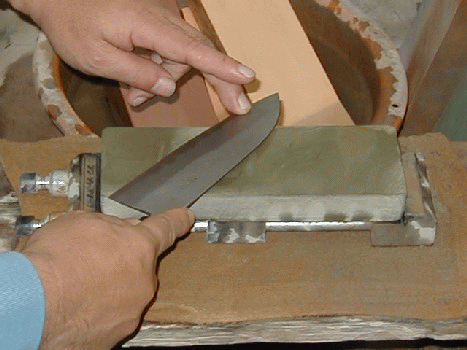 右効きの人は、柄を右手でしっかり握り、砥石に対し45度くらいの角度に添えて、刃先と砥石の接点に角度をつける為、若干(10円玉2枚半)くらい包丁の峰側をを持ち上げる。 左手は砥いでいる部分に添えるようにあて、柄に近い部分から前後に包丁を動かしながら研ぎ始め、次第に先端の方に移動していくそれを何度か繰り返していくと、研いでいる反対側の刃先に返リが出る、これをバリと言います。よく、向こうに押す時に力を入れるのか?引き戻すときに抜くのかと聞かれますが、要はスムーズに刃先の角度を維持しながら前後できればいいのですから、自分のやりやすい方法でいいでしょう。ただ、腕先だけで砥ぐというより、腰のリズムで研げればより安定した研ぎが可能です。 さて、バリが指先に少し感じるまで研げたら、今度は包丁を裏がえして、裏側を同じように研ぎます。この時包丁は、砥石に対してほぼ真横にしてやはり、刃先にさっつきより多小少な目の角度をつけて研いでください。傷みの少ないものは、中砥だけでも、表裏を丁寧に研いでバリがほぼ感じられなくなるまで研げば切れるようになります。刃先が欠けたり、磨耗のひどいものは、荒砥石で研いでから、中砥にかけてください。さらに良い刃を、望むなら、仕上砥石までかけられるといいでしょう。問題は刃先の角度をどれくらいにすればよいかですがこれは包丁の材質等や、切る物により多小違ってきます。比較的安いステン材質のものは硬度が低いので、角度をつけて研がないとすぐ切れなくなりがちです。ステンレスでも、ハイス鋼等の高硬度のものを割り込んだ三枚打ちの物は、比較的フラットに研いでも長く良く切れる刃が付きます。角度をつけて研ぐのは刃先が丸くなりやすく、手先の安定がいるので難しいのは当然です。ある意味で、良い包丁が研ぎ易く良い刃がつくと言われるのはこのような理由にもよるのです。 |