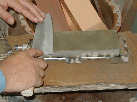 片刃は表側、即ち、切り刃のある側を、始めにほぼその切り刃の幅に刃元から先まで研ぎ、反対に返りが出たら、それを取るために裏をあてるわけですが、大事な事は、裏刃はなるべく軽く前後、または左右に、軽く押し付けて擦るような感じで 研ぐ事です。決して刃先を立てて研いではいけません。片刃が両刃になり、以後悪循環 に陥ります。砥石の面が平らでないといけない事は言うまでもありません。又、良く使う部分だからと言って、先のほうばかり研いで鶴の嘴のようになった包丁を見かけますが、これも感心しません。なるべく元から研ぐ癖をつけられると、長く、形良く使っていけます。片刃包丁の良し悪しは、裏刃の隙が均一で綺麗に入って入るかどうかである程度見分けられます。隙の悪い物は、当然裏刃を立てないと、バリが取れず困るからです。 |