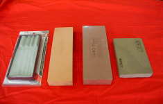 | 左から印刀、 極浅曲がり、丸刀、鎌倉刀、三角刀 彫刻刀用砥石、油砥石、 中砥石、仕上げ砥石 丸刀類の研ぎ方は、まず刃先の変形を中砥石で垂直にこすり直します。 刃先は当然厚くなります。これを中砥石か油砥石で同じように凌ぎ刃の 中心から研ぎ始め、なるべく丸く成らないように注意しながら刃先まで砥ぎ 下ろしていくと、刃先に返りが出ます。この時砥ぎ過ぎないよう刃先の状態 を見ながら少しずつ砥いでいくことが大事です。刃先全体に少しでも返りが 出たらそれを取ります。この時は、仕上げ砥石などの、角を丸くしておいて、 その角に刃裏をあてて前後して取り除きます。一度では奇麗に取れないので 何度か表と裏を砥いで取り除いてください。仕上げ砥石で丁寧いにやるほど、 刃先は奇麗に仕上がります。注意する事は、凌ぎ刃の同じところ ばかり研い でると、刃先がその部分だけくぼみ、形が崩れます刃の部分を回しながら、 少しずつ砥いで下さい。無論多めに砥ぎ薄くなってるところは、少なめにと、 神経を使わなくてはいけません。慣れるまでは、難しいかもしれません。 やはり基本は、平刀類がきちっと砥げることがだいじですね。 彫刻刀専用砥石を使うと、始めから砥石に丸いくぼみがあるので、それに沿っ て刀を前後すればよく簡単ですが、どうしてもきちっとした凌ぎは出ません。 とりあえず刃がつけばという事なら、便利です。 これで砥いでいて丸くなり、切れ味がよくない時は専門家に任せて修正して もらうといいでしょう。三角刀は、一番難しいかもしれません。刃先を整え、 やはり凌ぎ刃の中心から砥ぎますが切っ先が合うように砥がねばなりません。 角の部分ばかり力を入れると、角がへこみ収集がつかなくなります。 少しずつ角に迫る感じで砥ぎ進むとが大事です。 裏刃は三角形の形をした油砥石でこするようにして取ります。 この他にも、耐水ペーパーを使い、刃を前後でなく、左右にローリングしながら 砥いでいく方法や 電動の研ぎ機を使う人もいます。いろいろな砥ぎ方があり ますが、やはり砥石で砥ぐのが一番だと思います。 |